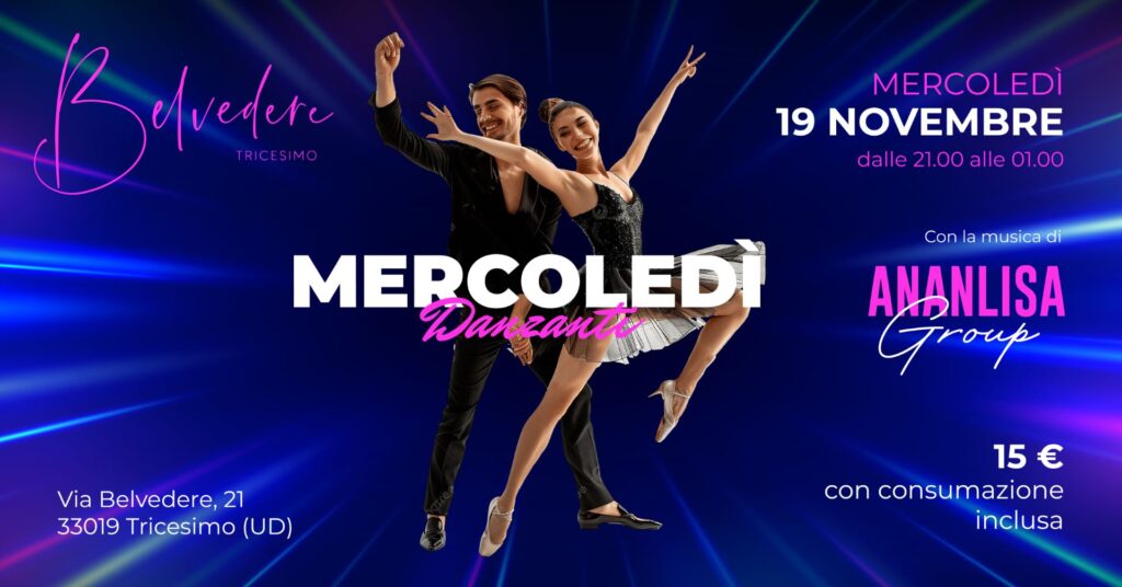 Gioia ed energia pura! Mercoledì 19 Novembre vi aspettiamo per una serata dinamica e coinvolgente, dove ogni movimento esprime felicità e la musica dal vivo diventa pura magia.